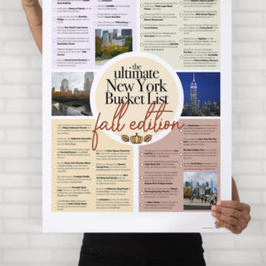 De stoepjes voor de huizen zijn prachtig versierd met pompoenen en andere Halloween decoraties en de bomen in de straten zijn verkleurd. Dit zorgt voor de mooiste foto’s! Ook kun je een Pumpkin Patch bezoeken, Apple Cider proeven, een Pumpking Spice Latte drinken en noem zo maar op. De ultime herfst bucket list hebben wij vormgegeven en kun je downloaden op Etsy voor slechts 0,99 ct. Deze poster print je gemakkelijk uit en hier kun je al je (herfst) activiteiten op afvinken. Natuurlijk staan er ook geweldige NYC tips op die sowieso niet mogen ontbreken. Denk bijvoorbeeld aan een bezoek aan een observatiedek.